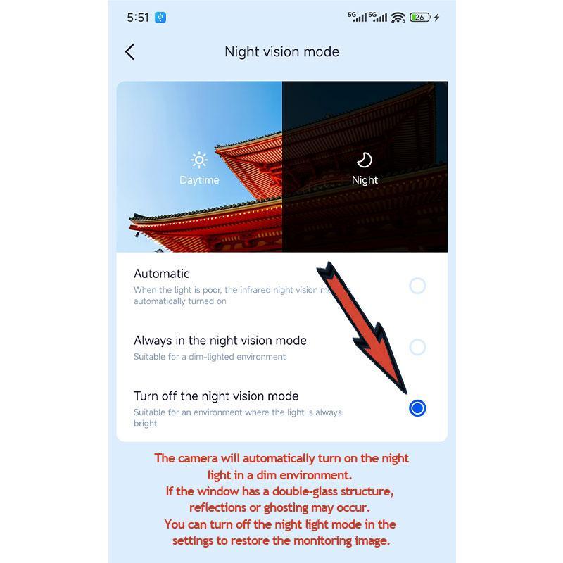 Tight InventoryImportant NoteThe camera will automatically turn on the night light in a dim environment. If the window has a double-glass structure, reflections or ghosting may occur. You can turn off the night light mode in the settings to restore the monitoring image.